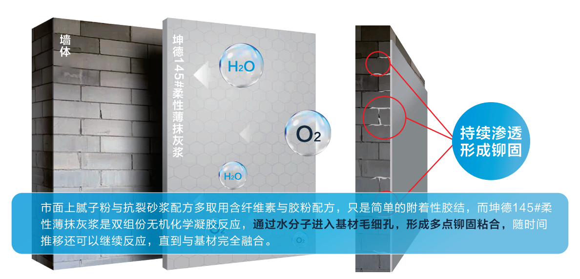 市面上膩子粉與抗裂砂漿配方多取用含纖維素與膠粉配方,只是簡單的附著性膠結(jié),而坤德145#柔性薄抹灰漿是雙組份無機化學(xué)凝膠反應(yīng),通過水分子進入基材毛細孔,形成多點鉚固粘合,隨時間推移還可以繼續(xù)反應(yīng),直到與基材完全融合。